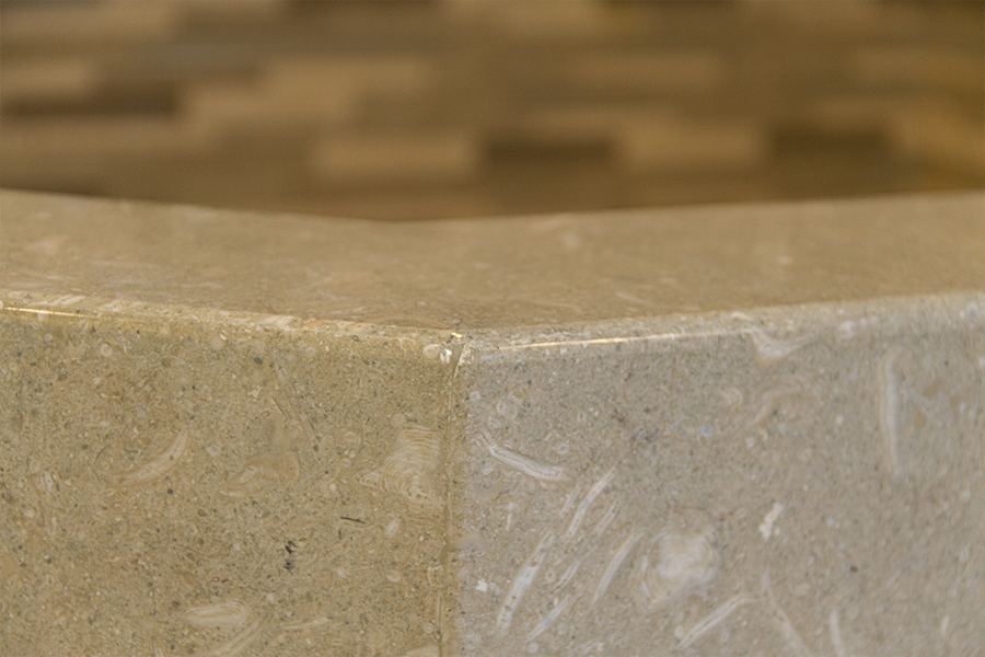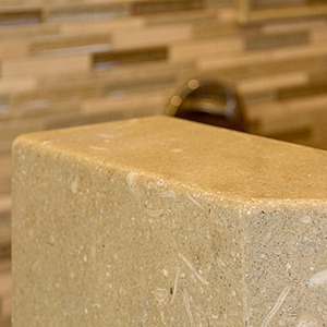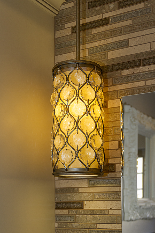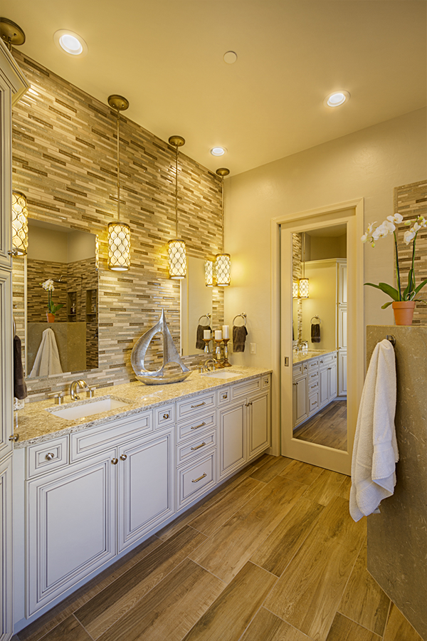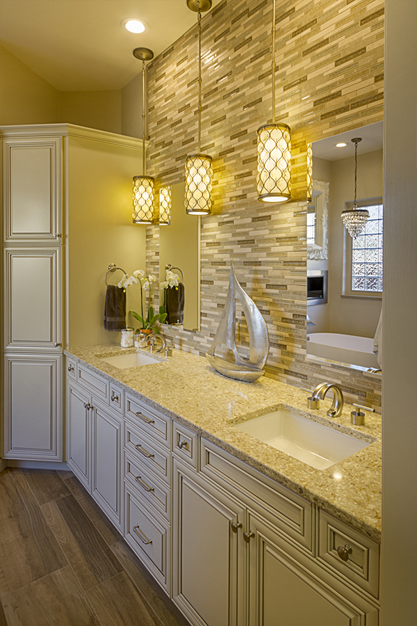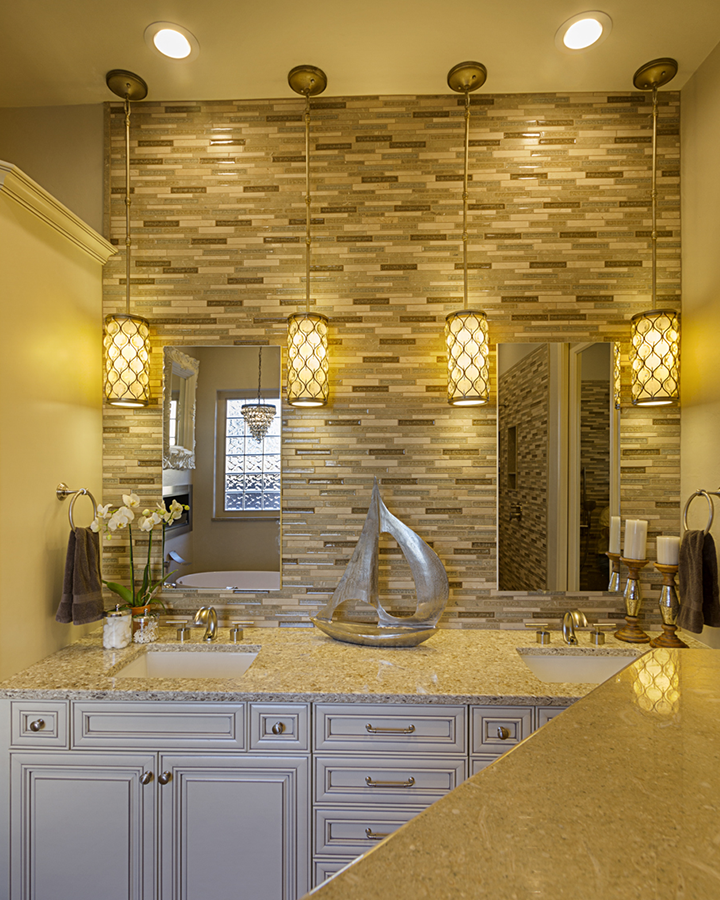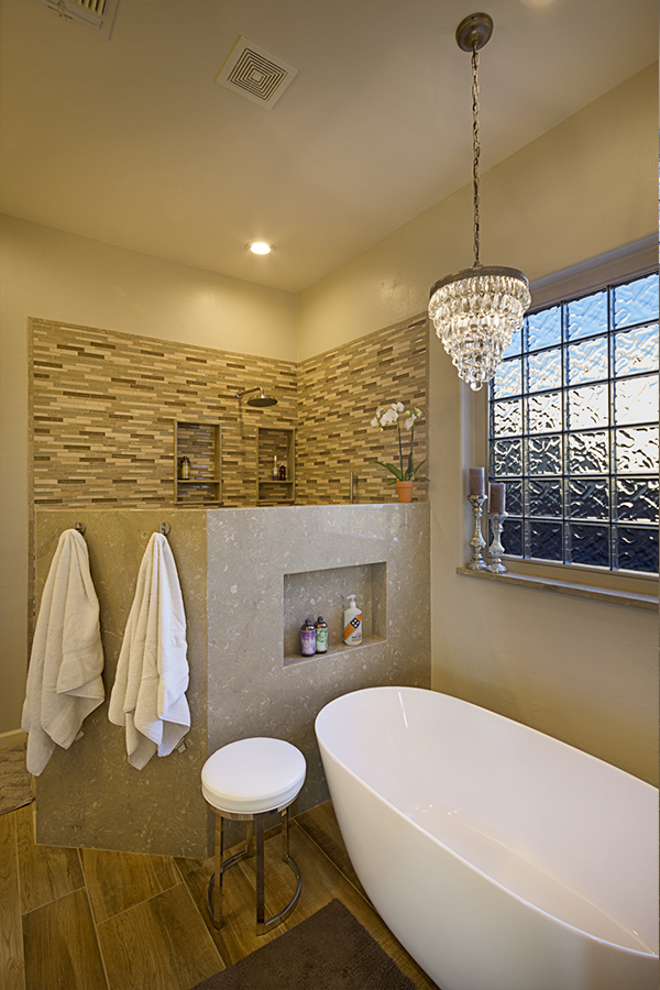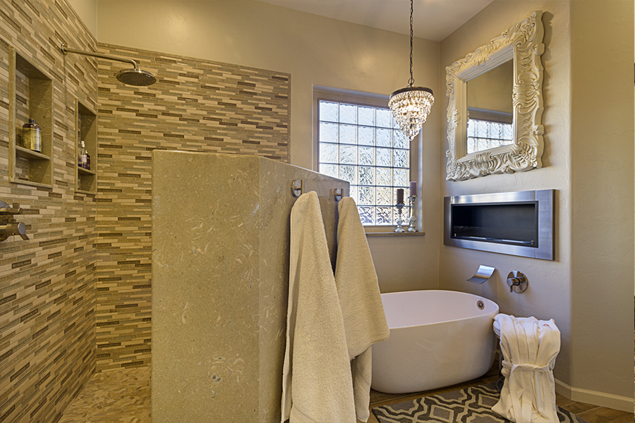 When the owner of a granite shop desired a new bathroom for his wife, there were no limits on the use of stonework and he asked for elements that would make a woman feel like a queen. The centerpiece began with taking out the basic tub and shower enclosure in exchange for a freestanding tub paired with an ethanol fireplace and topped with a crystal chandelier to create an ambiance of romance and ultimate relaxation. Finding a color palette that incorporated grey and bridged the gap between trendy grey and the home’s existing warm earthy color palette was made simple with a glass and stone tile that blended both warm and cool. The mixture of materials had such a nice feel it was incorporated in the shower and was featured behind the vanity area for a dramatic effect.