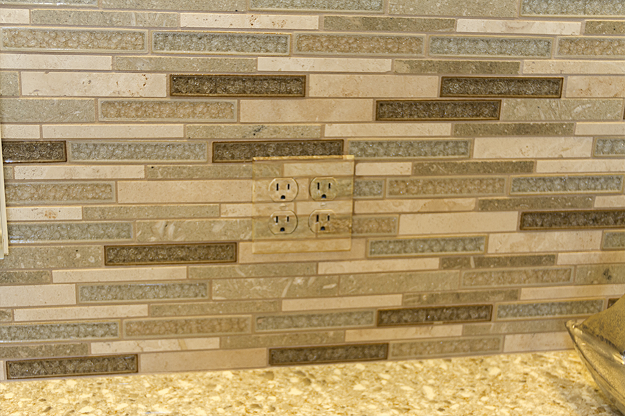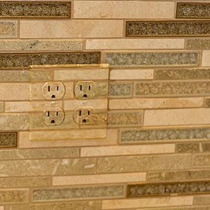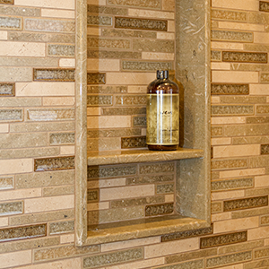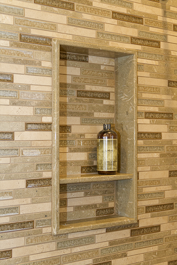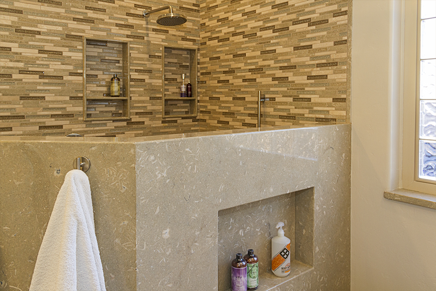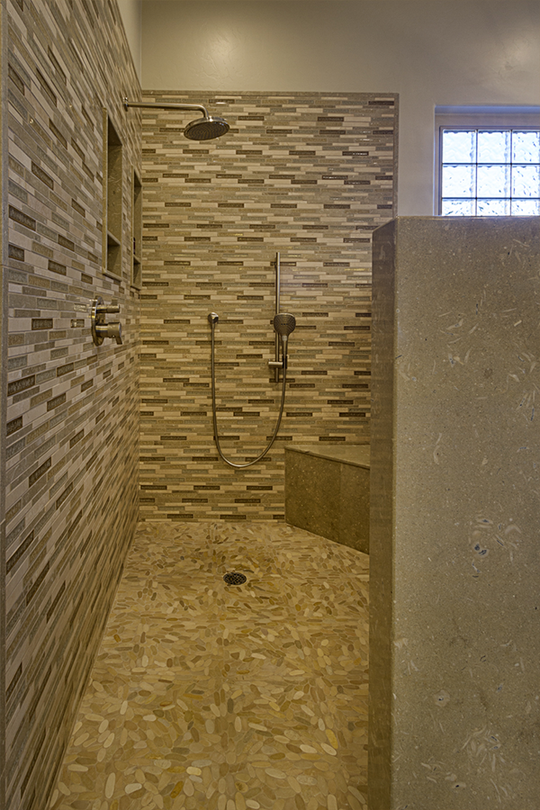The natural stone in the tile blend was available in slab form and the owner didn’t flinch at the idea of cladding the privacy wall in the shower with the stone. It makes for a very durable, low maintenance and attractive feature. To gain more storage space an awkward corner linen cabinet was removed to create a longer vanity and a linen cabinet with more flexible storage in adjustable shelves. Losing the one wall led to placing the medicine cabinets over each sink and finding units with the added feature of an interior outlet.