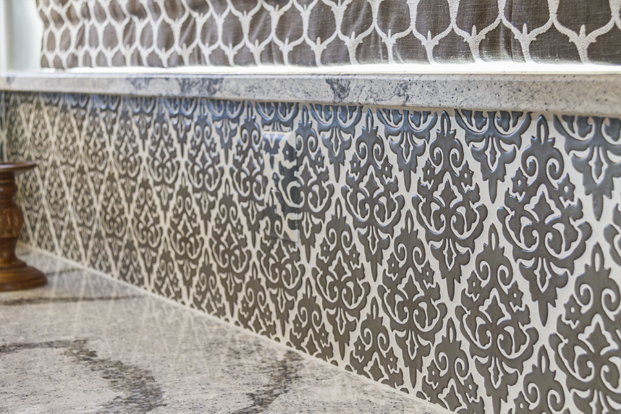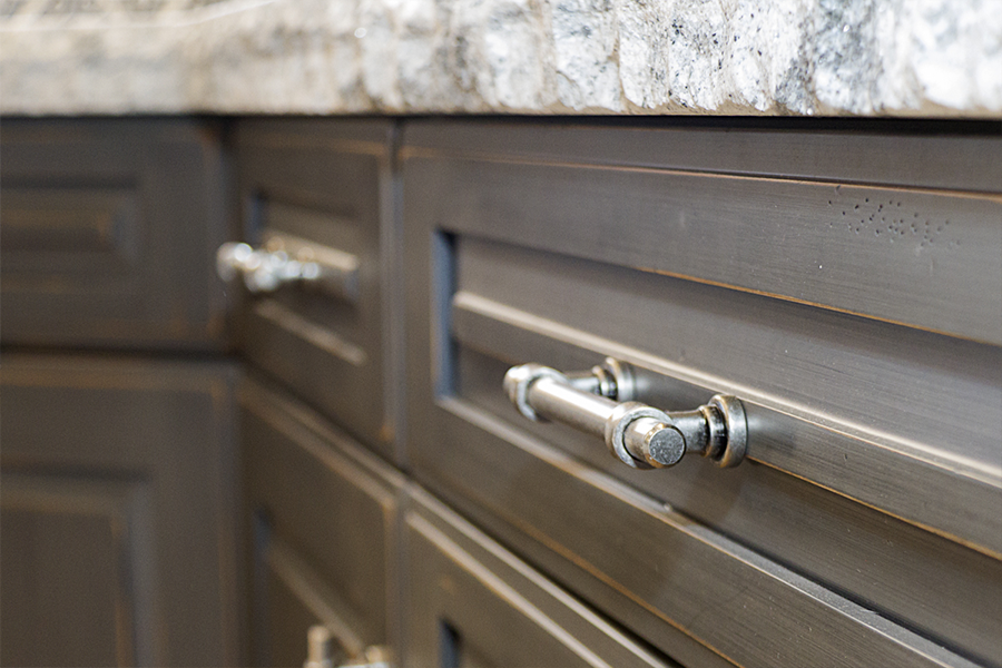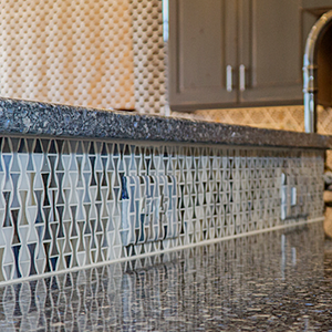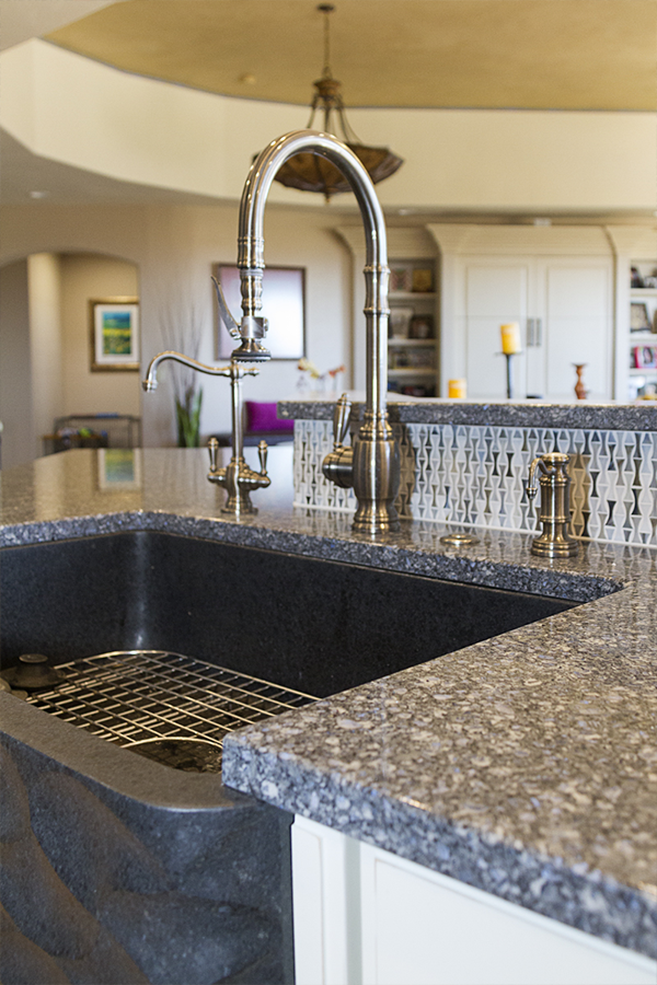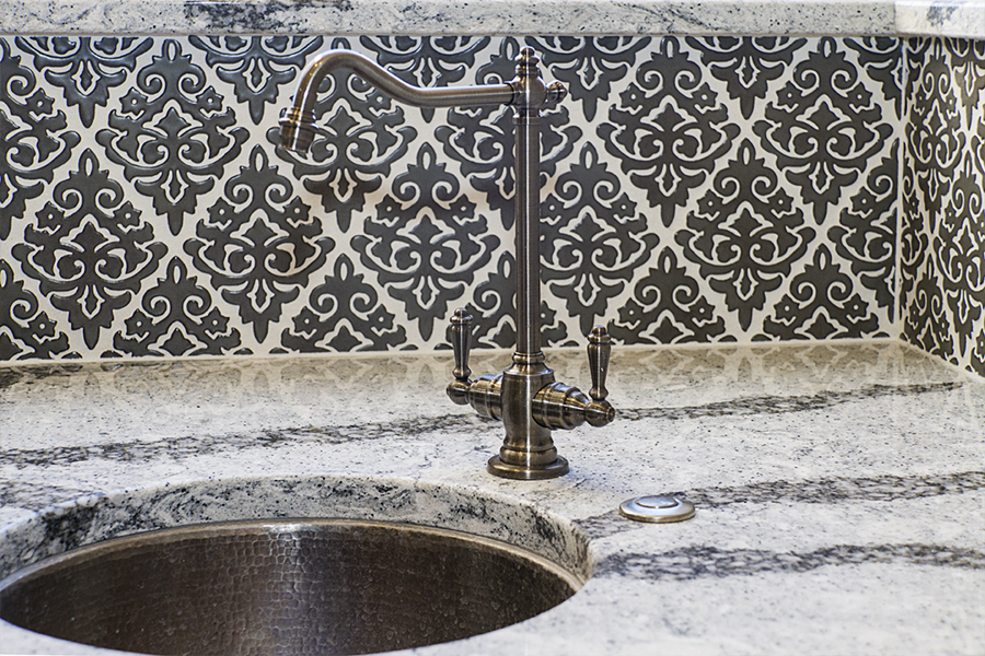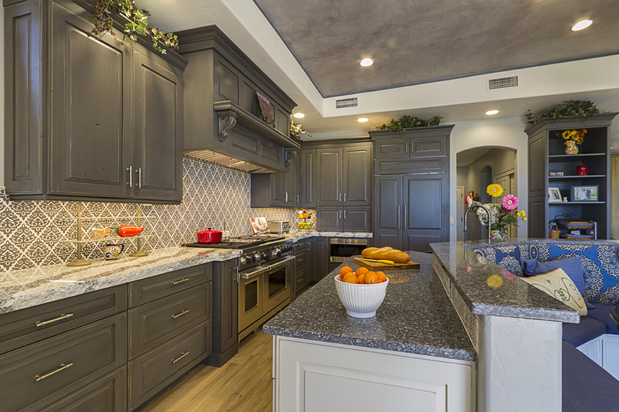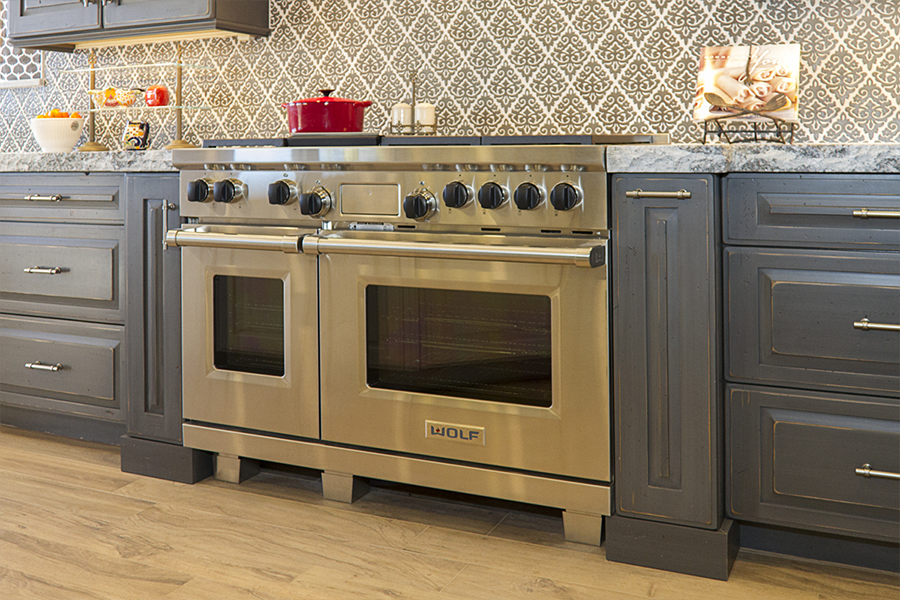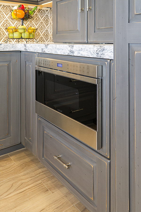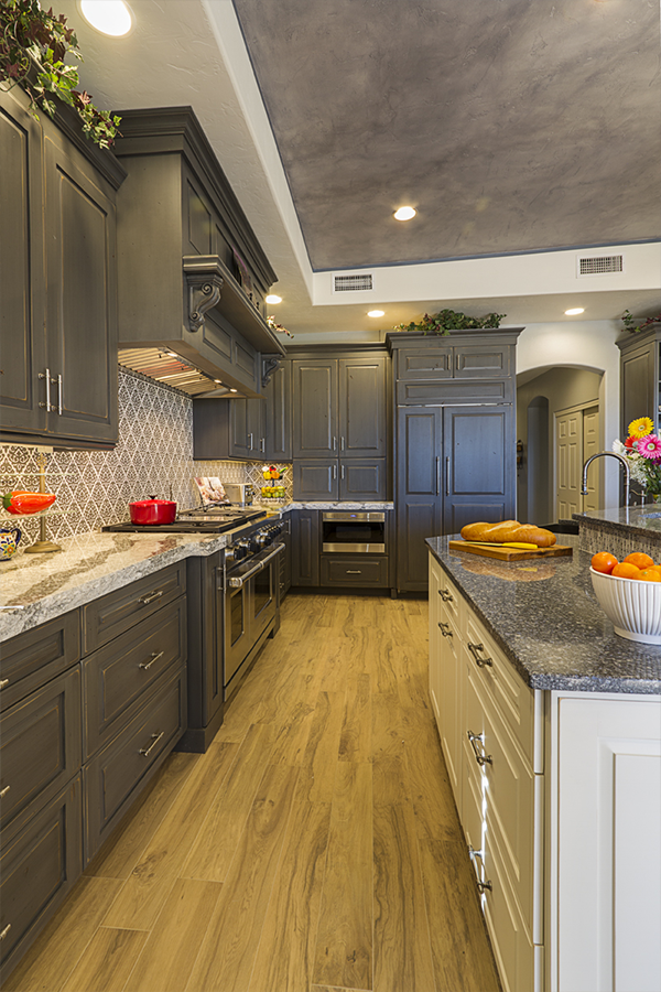 New Wolf gourmet appliances helped create an architectural focal point with a massive hood above the dual fuel range. The large SubZero refrigerator was clad in custom wood panels and a two tone color scheme established the traditional look of fine furniture. Double thick chiseled edge counters are low maintenance and gorgeous. Final touches with handmade backsplash tile, antique faucets and a custom painted ceiling tray made this remodel spectacular.