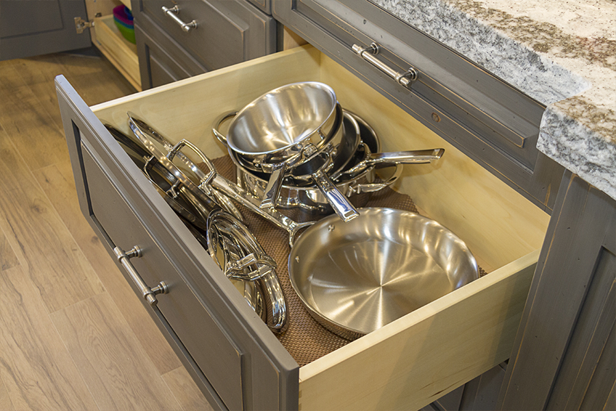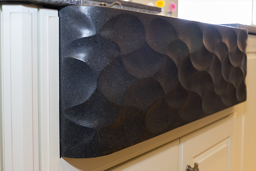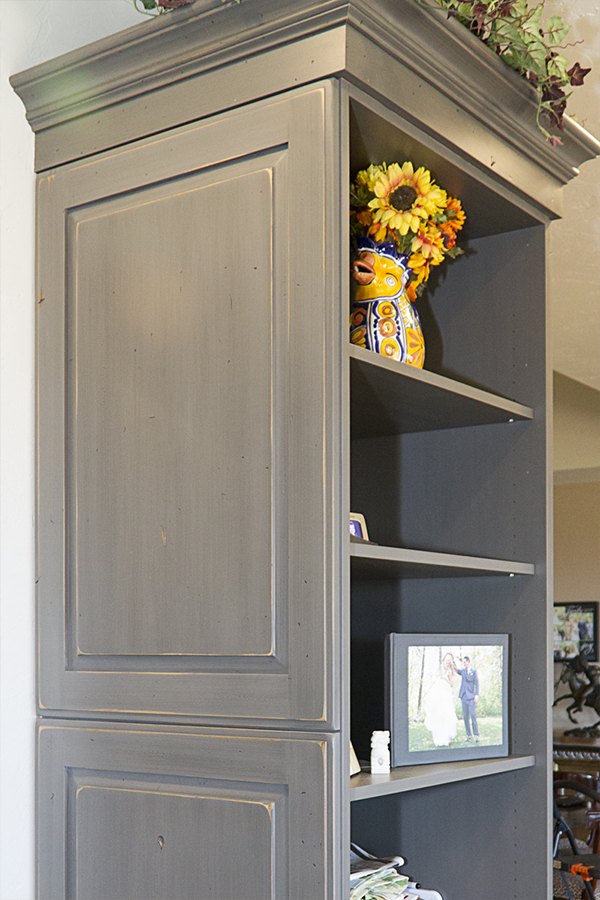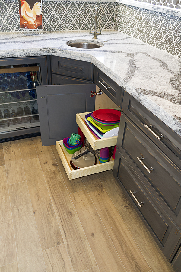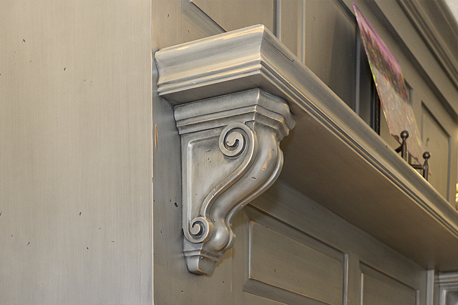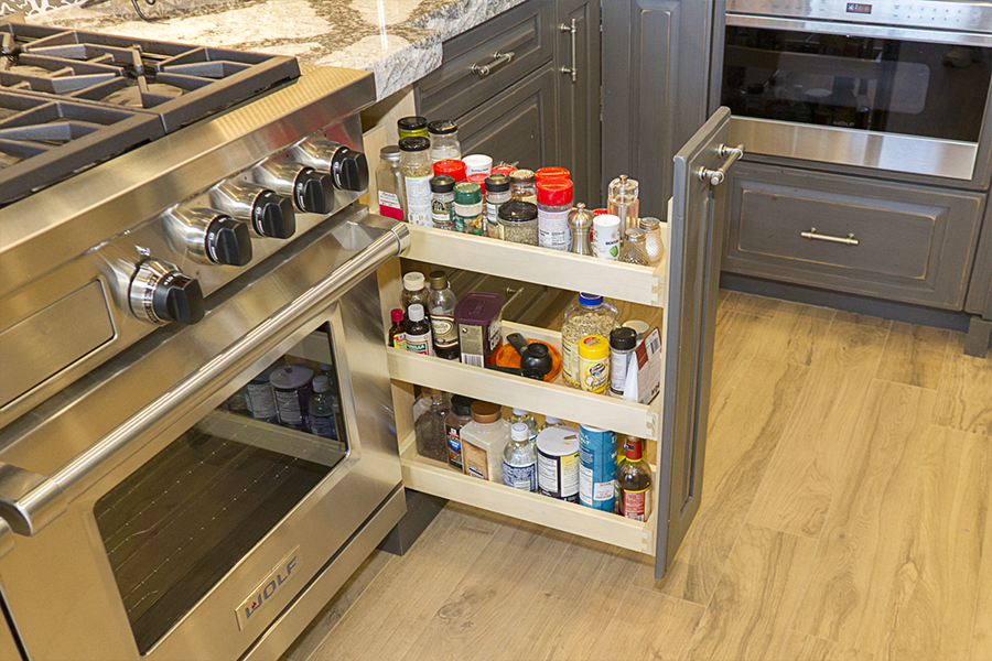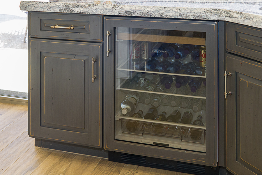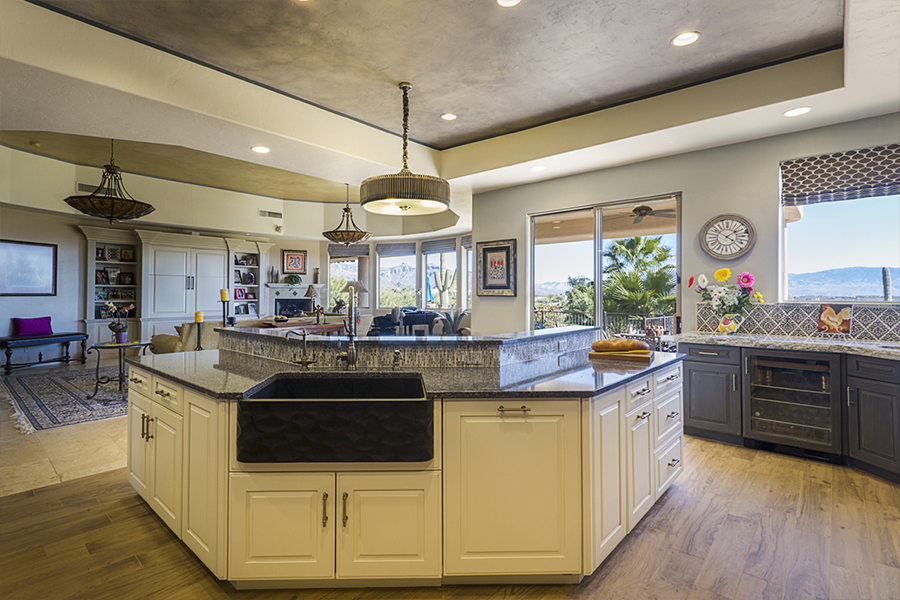 New Wolf gourmet appliances helped create an architectural focal point with a massive hood above the dual fuel range. The large SubZero refrigerator was clad in custom wood panels and a two tone color scheme established the traditional look of fine furniture. Double thick chiseled edge counters are low maintenance and gorgeous. Final touches with handmade backsplash tile, antique faucets and a custom painted ceiling tray made this remodel spectacular.