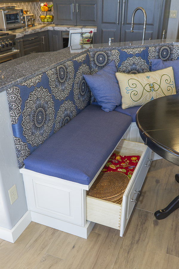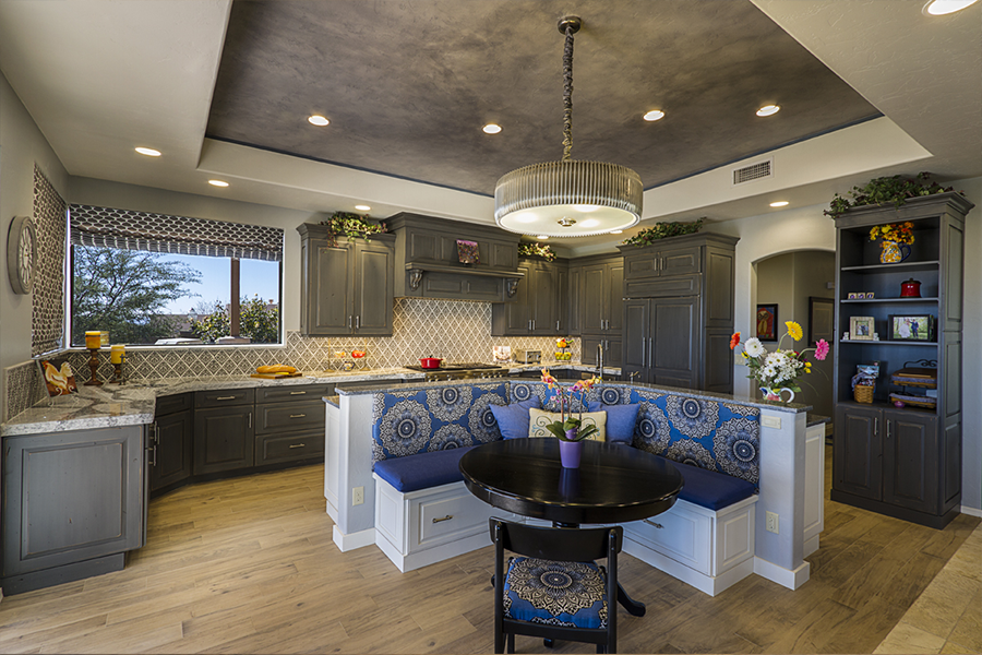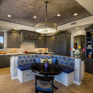 The existing kitchen was just average and the owner wanted her kitchen to be spectacular! She requested a combination of gourmet appliances, sumptuous colors with richly textured patterns and combinations of the most current and unique materials. The plan was to improve accessibility from the living and dining room by removing a long separating wall and creating a luxurious island concept by incorporating the breakfast nook space.
