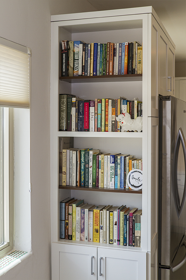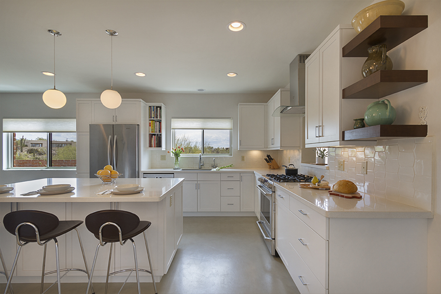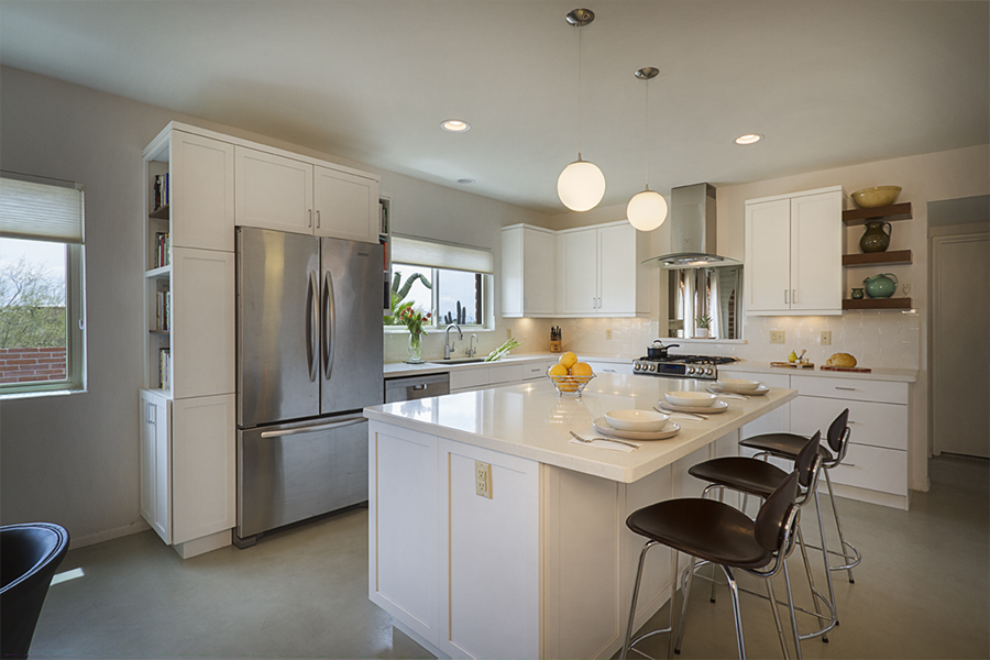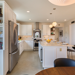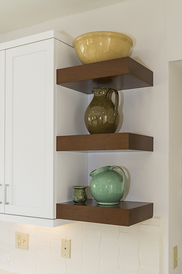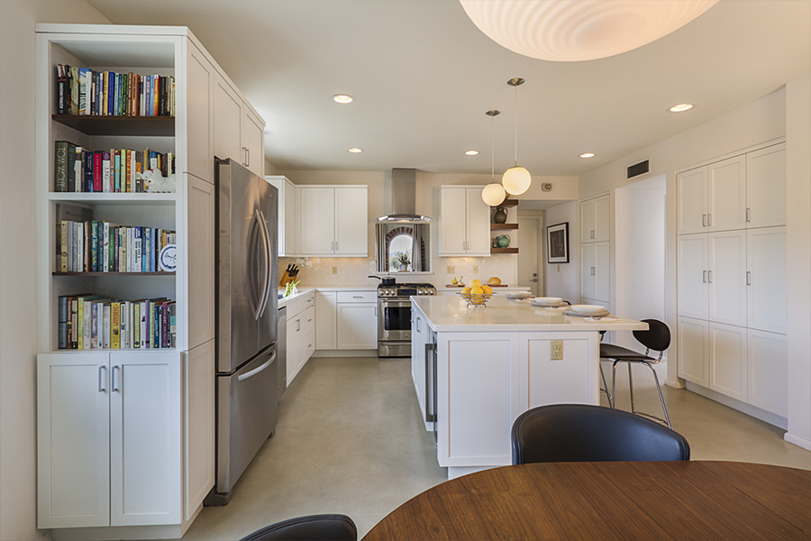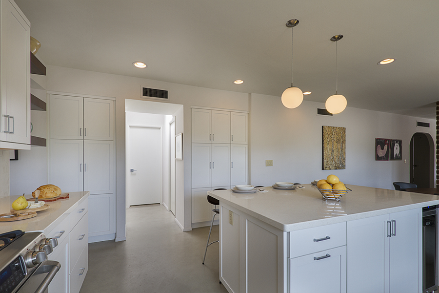 The buyer of this Mid Century Modern house could see through the outdated façade and had a clear vision of what it could be. Topping the list of improvements were opening up walls, simple low maintenance materials with a natural color palette and an atmosphere conducive to working from home. Knocking through a front closet and a wall that separated the dining room and kitchen was no small feat. It required relocating major appliances and reorganizing some mechanical equipment in the ceiling. A timeless simple white shaker cabinet layered with white counters and white backsplash was highlighted with some rich cherry shelves.