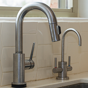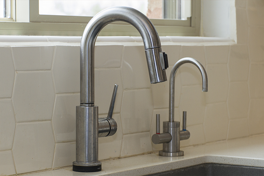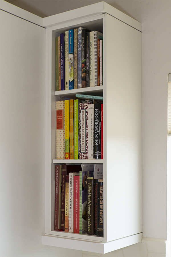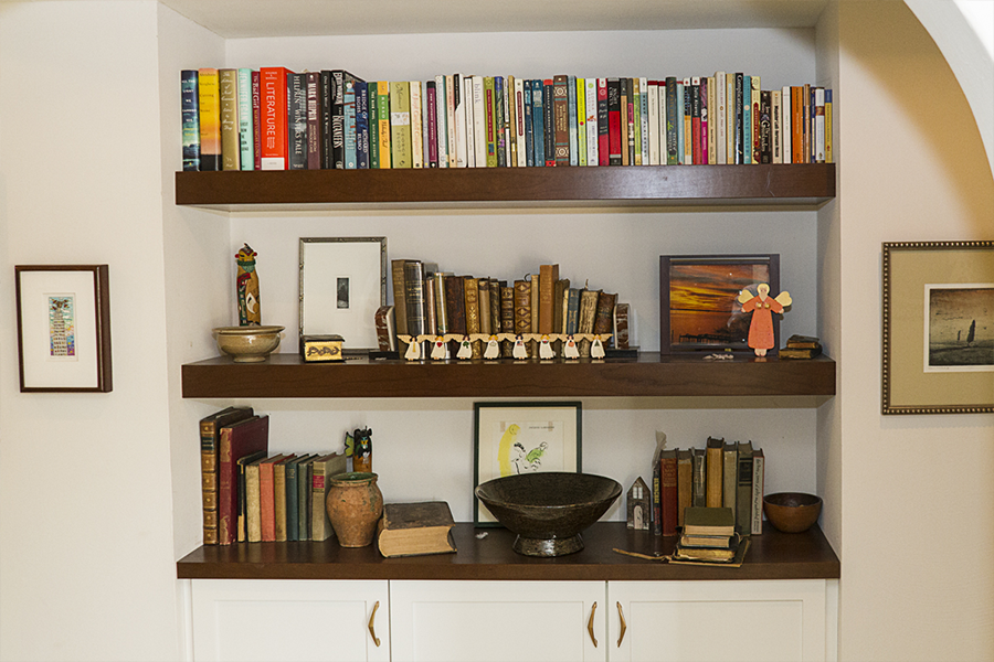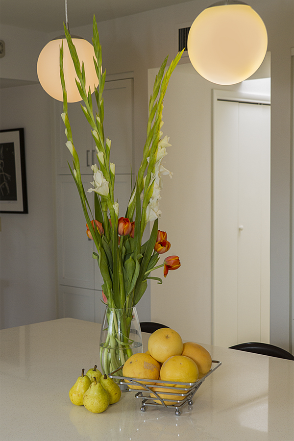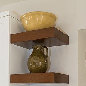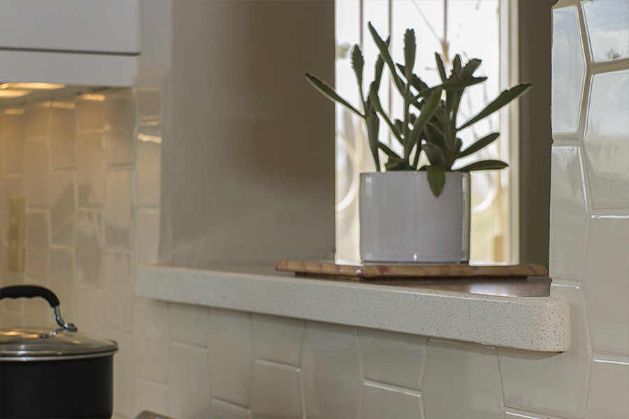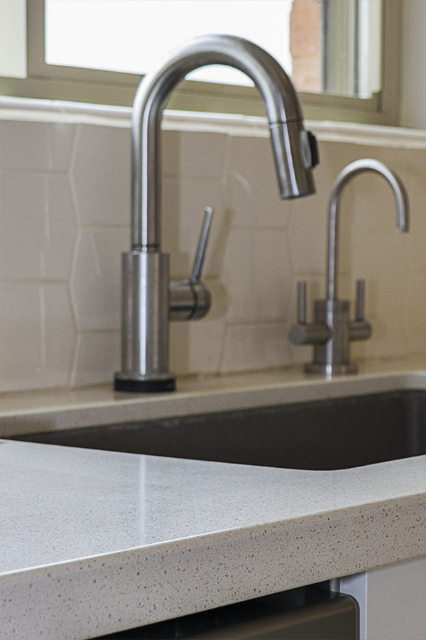 The buyer of this Mid Century Modern house could see through the outdated façade and had a clear vision of what it could be. Topping the list of improvements were opening up walls, simple low maintenance materials with a natural color palette and an atmosphere conducive to working from home. Knocking through a front closet and a wall that separated the dining room and kitchen was no small feat. It required relocating major appliances and reorganizing some mechanical equipment in the ceiling. A timeless simple white shaker cabinet layered with white counters and white backsplash was highlighted with some rich cherry shelves.