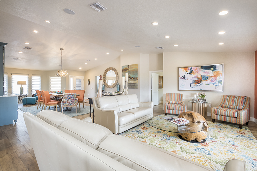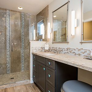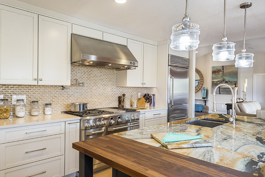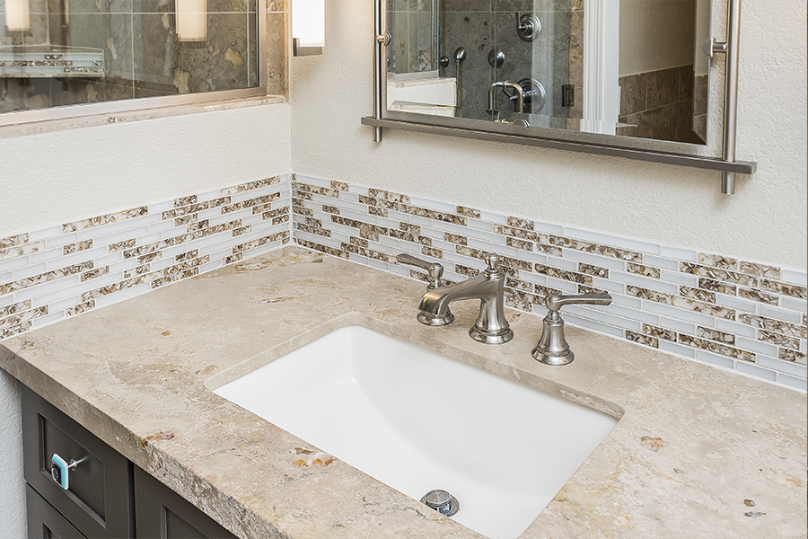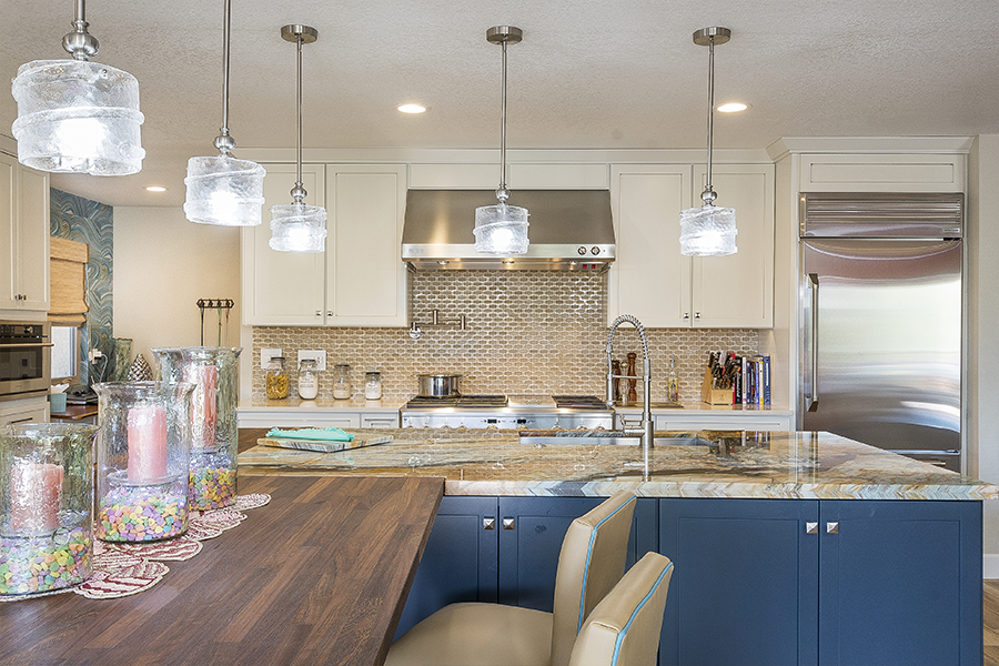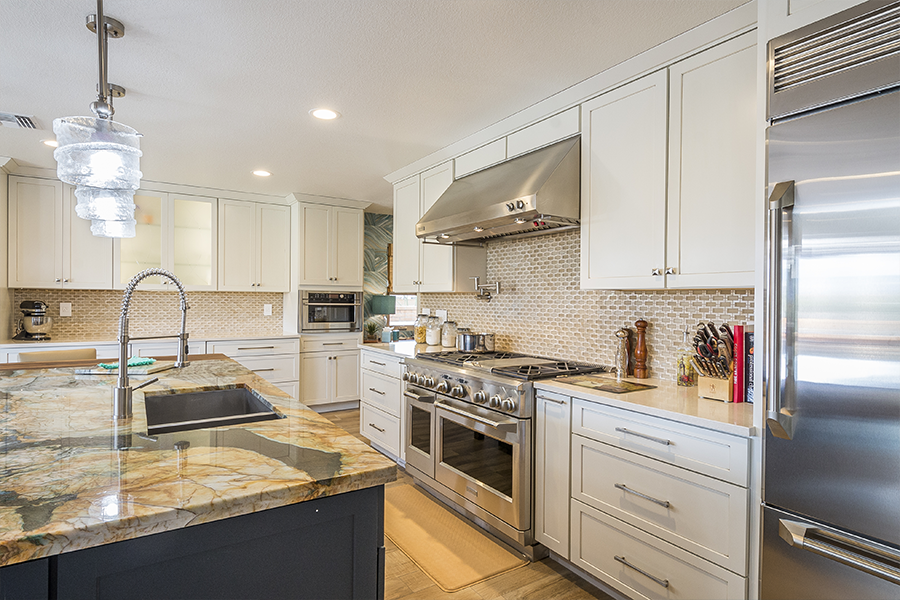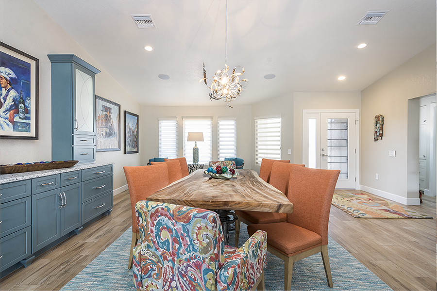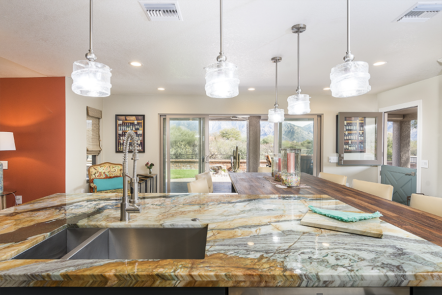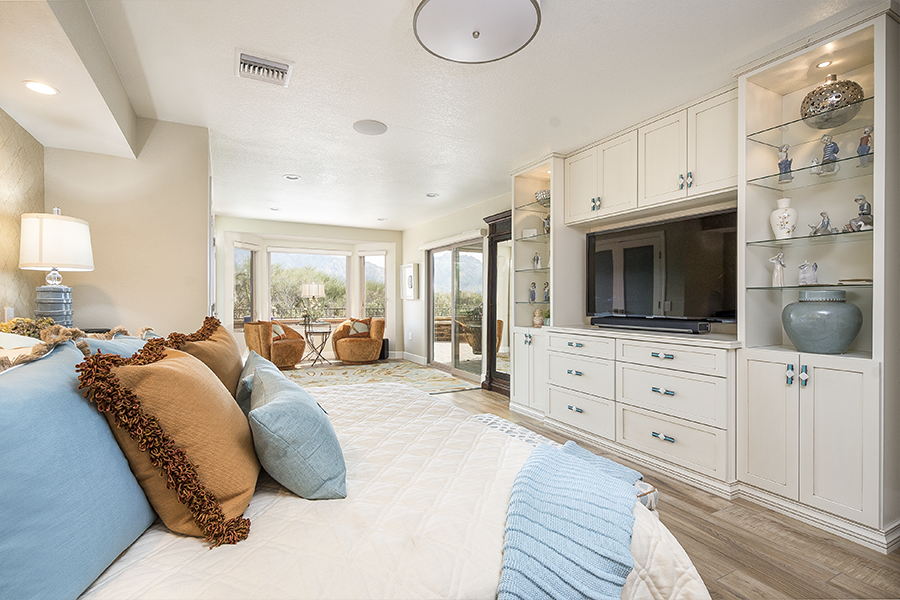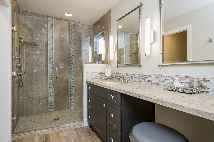 When the space in the kitchen didn’t allow for a large enough island we took over some patio and relocated the laundry room to make space for wine storage and a desk. When the dining room was closed off from the living room, we knocked down all the walls in the middle of the house to create an open floor plan and added a wall of doors to extend the living space outside. Once we designed the master suite to fit the vanity and walk-in shower, we decided it would be nice to have doors out to the patio, a separate closet for him and remember the laundry we moved, we decided it would be nice to just have that closer to the closets, so we did an another addition. It all came together and we turned an average subdivision home into a masterpiece!