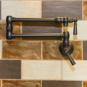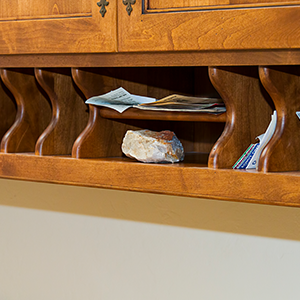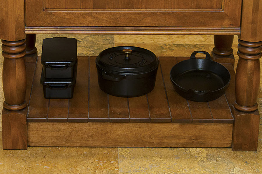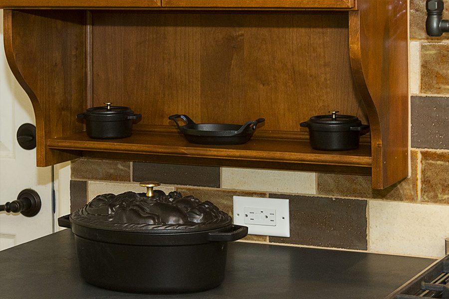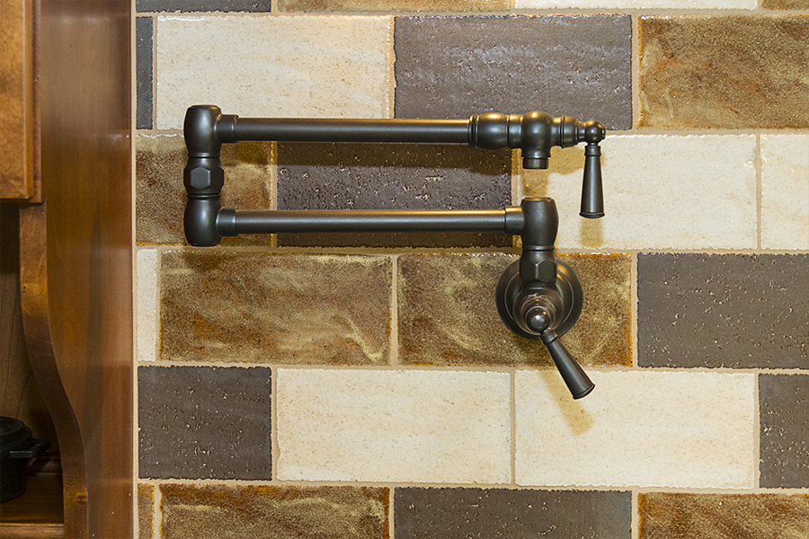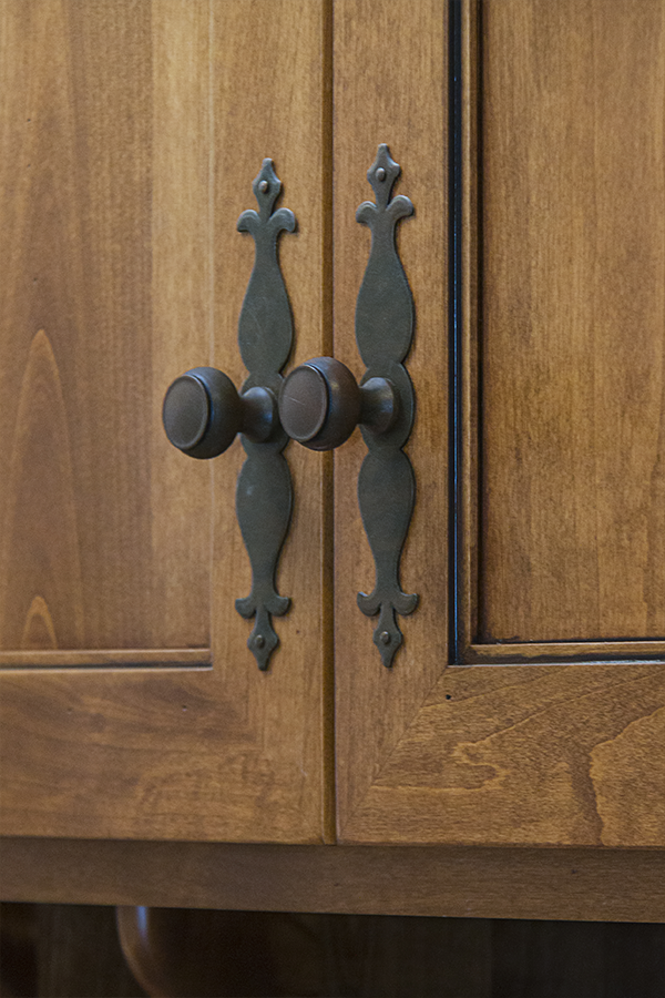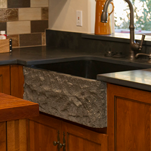 We removed the low ceilings and relocated the pantry and refrigerator to allow the cooking center to be a focal point. Changing the U-shape sink layout to an L-shape made space for a quaint island and gave better access to the eat-in nook. Moving the laundry area to the back of the house/near the bedrooms, opened the door to create a small office off the kitchen which is the hub of activity. Blended Rustic Travertine tile floors were a warm addition away from the cold rose/white ceramic floor tiles and helped pave the path towards the Rustic theme of the house. A distressed alder cabinet with unique chamfered edges was simple and interesting paired with black slate counters and handmade ceramic tile backsplash. A chiseled edge granite sink was the cherry on top of this remodel.