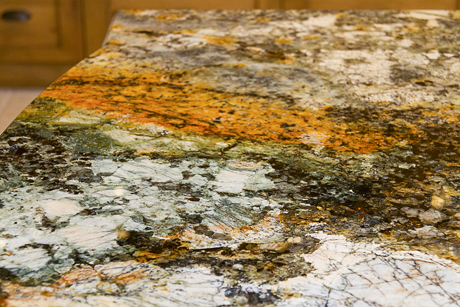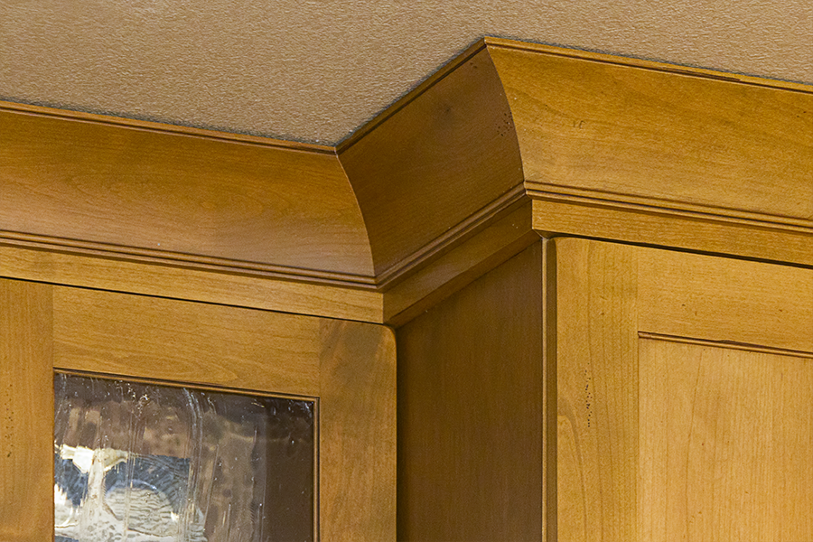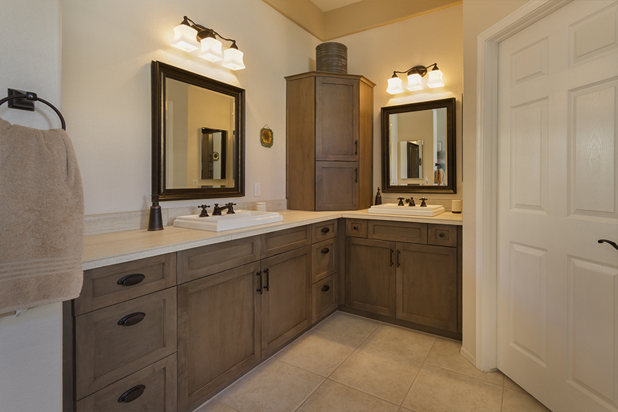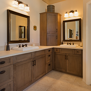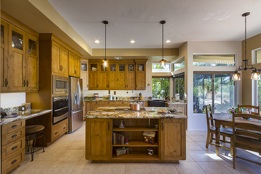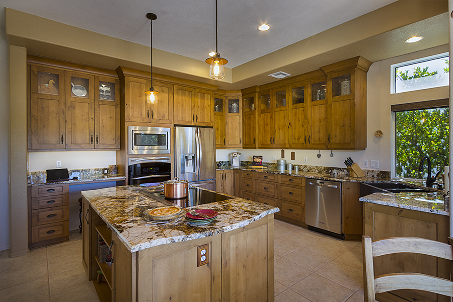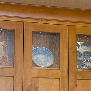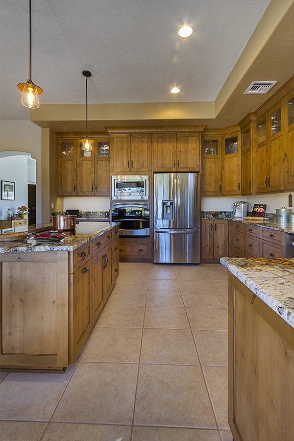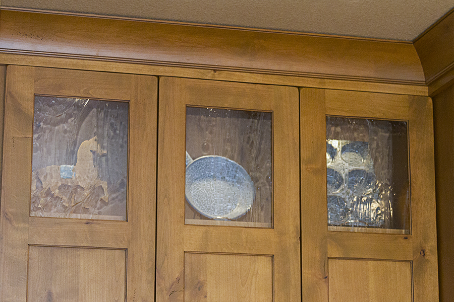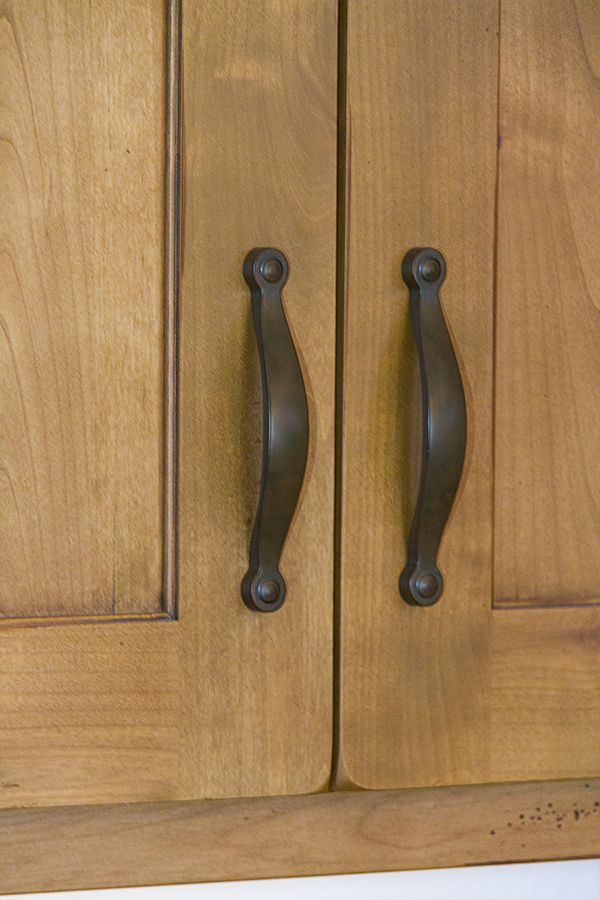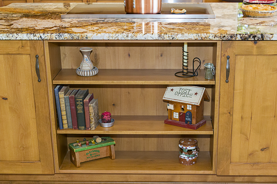 We added a bit more glaze and distressing to give that time worn look to the cabinets. Instead of leaving a gap above the cabinets, we decided to stack cabinets to the ceiling a make feature display for all the items collected to go above the last kitchen. The granite at the last house was pretty, but it was only moderately interesting so the owner’s decided to invest more into a WOW material that they could use as counter and splash. Clever storage was created to hide the mixer in the island and to create pantry space without a traditional pantry. And while sit down desks are being replaced more and more, a counter height planning station was created for charging and browsing away from food prep and dish washing.