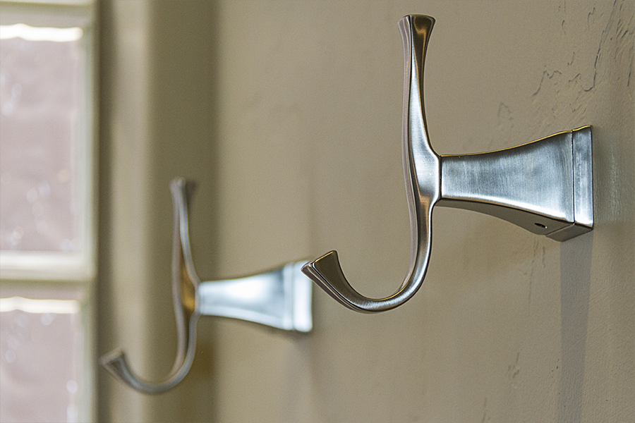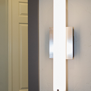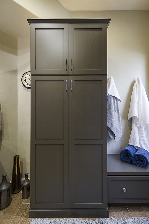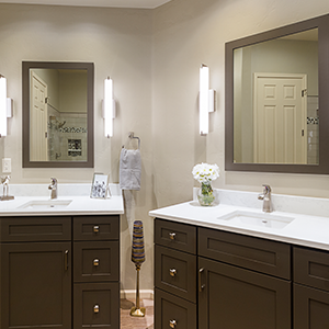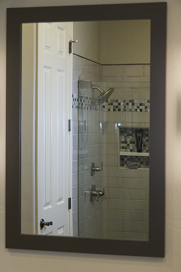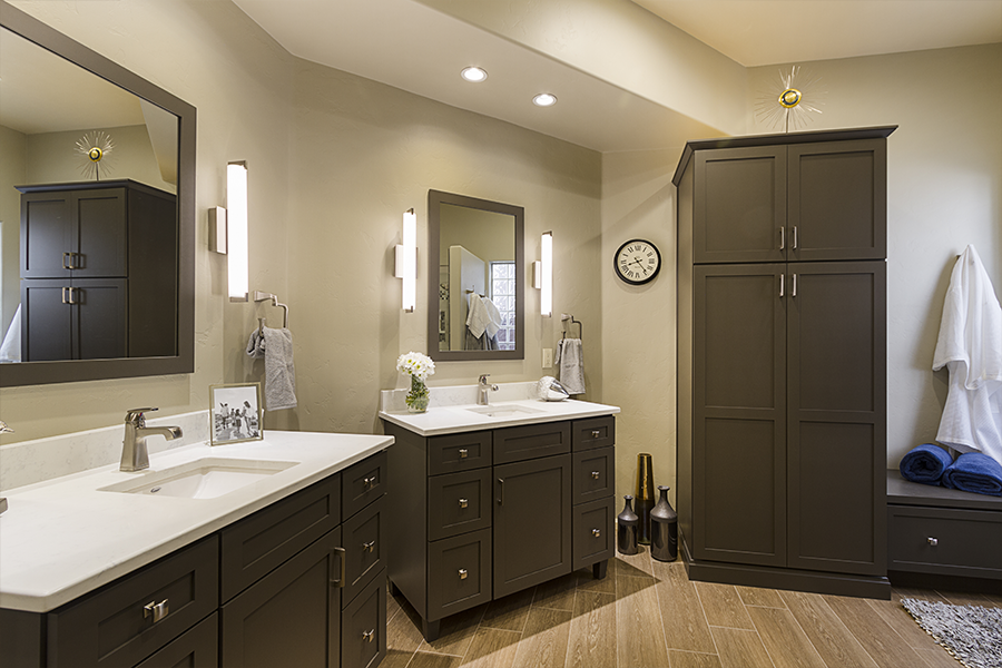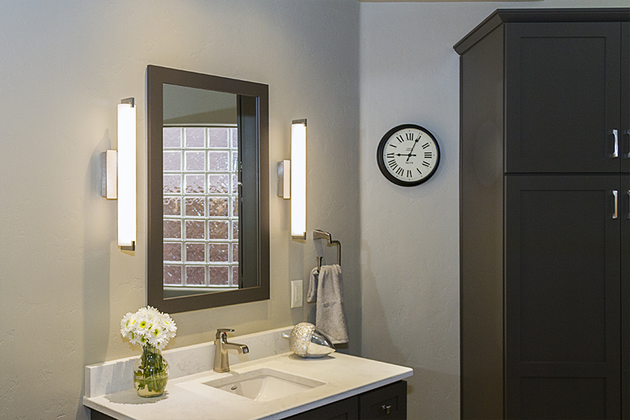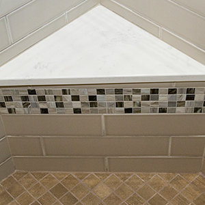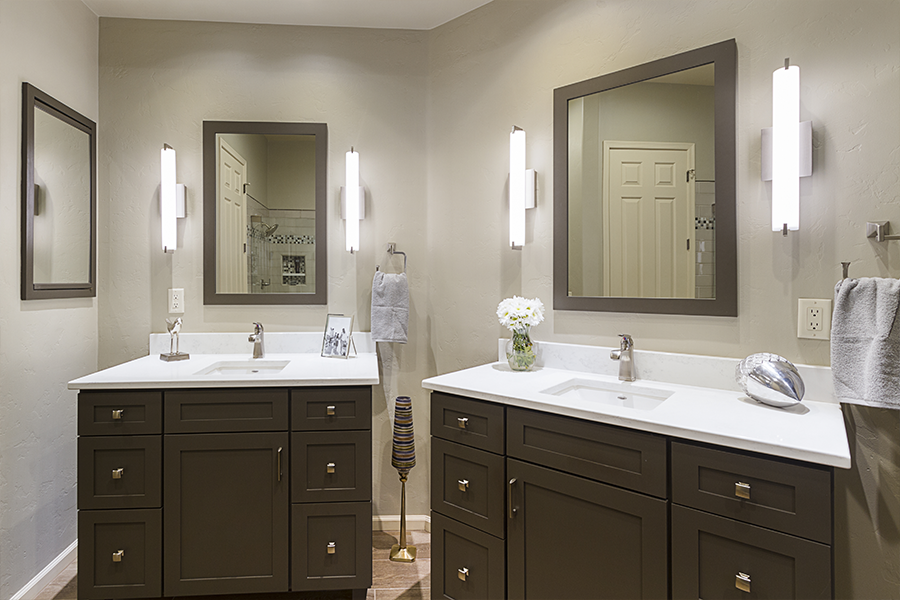 We removed an unused tub and created a spa-like locker with towel/robe hooks and storage. Even though the shower kept the same space, adding soap niches, a shower bench and a seamless glass enclosure was a huge overall improvement. For the vanity area, being at an angle with two sinks and just plastering cabinets to fit the space was to be expected. We decided to create two freestanding pieces of furniture that had a ton of storage with single framed mirrors. Lighting was important and improving the recessed can light layout with adding sconces to throw more illumination around the mirrors did the trick.