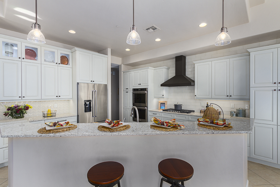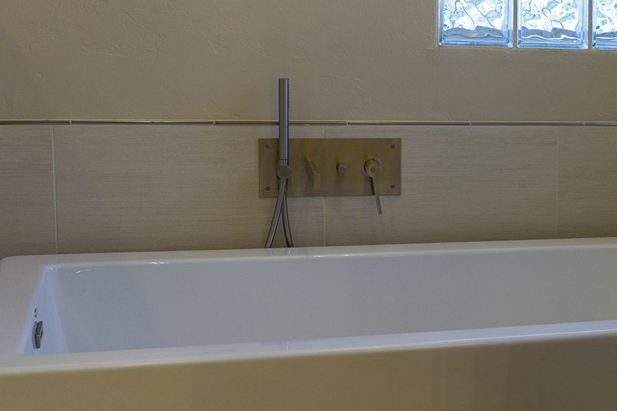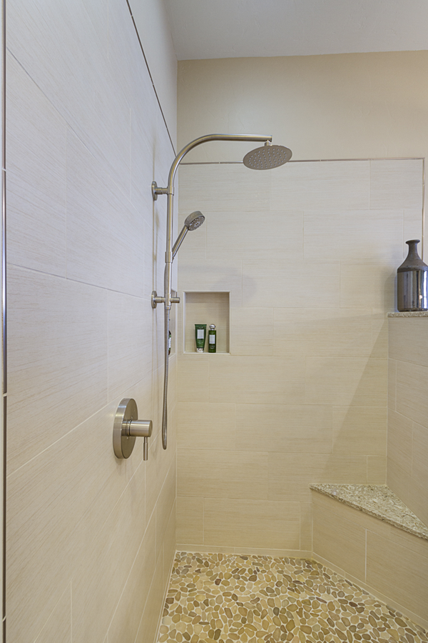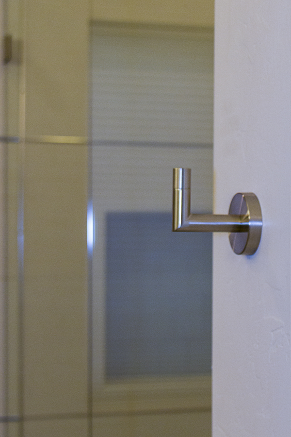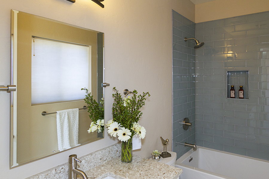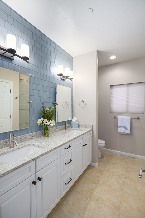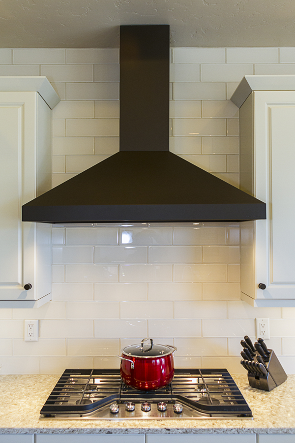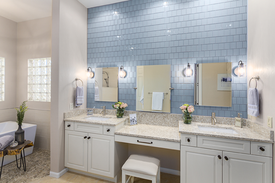 In the kitchen, the details that made the difference were: 1) stacking cabinets higher with glass on one side to add interest 2) adding dark bronze accessories to contrast against the white 3) varying the backsplash design on separate walls and taking it up around the hood area. In the bathroom, the details that made the difference were 1) filling in the floor for a freestanding tub with a natural pebble stone to look intentional 2) accenting with the same bronze in the fixtures and accessories 3) creating feature walls with tile art design.