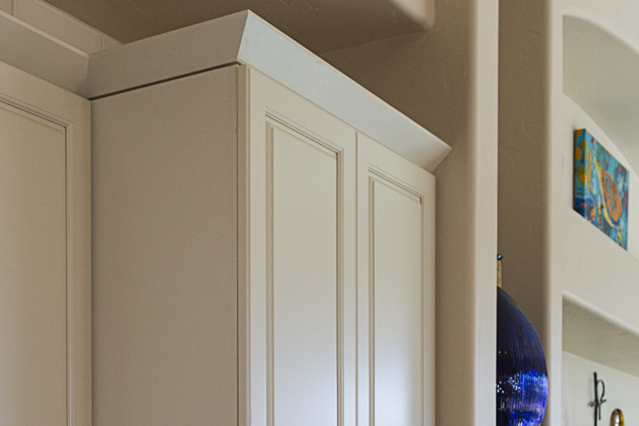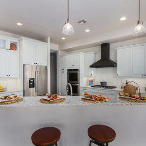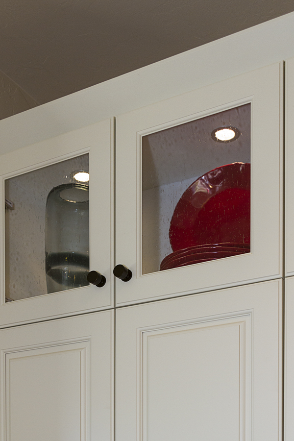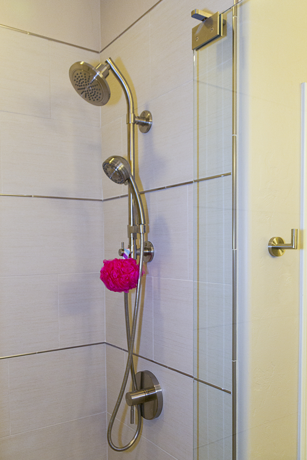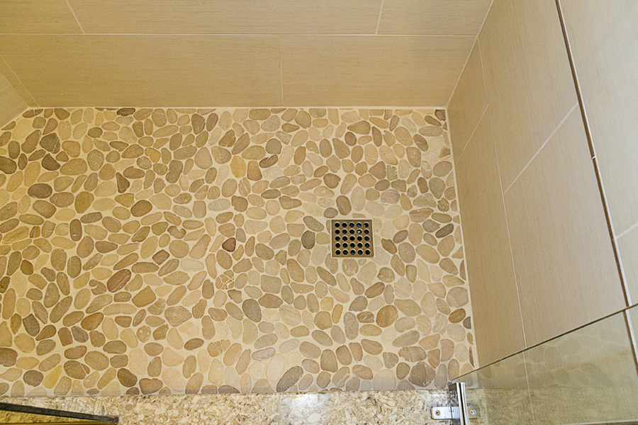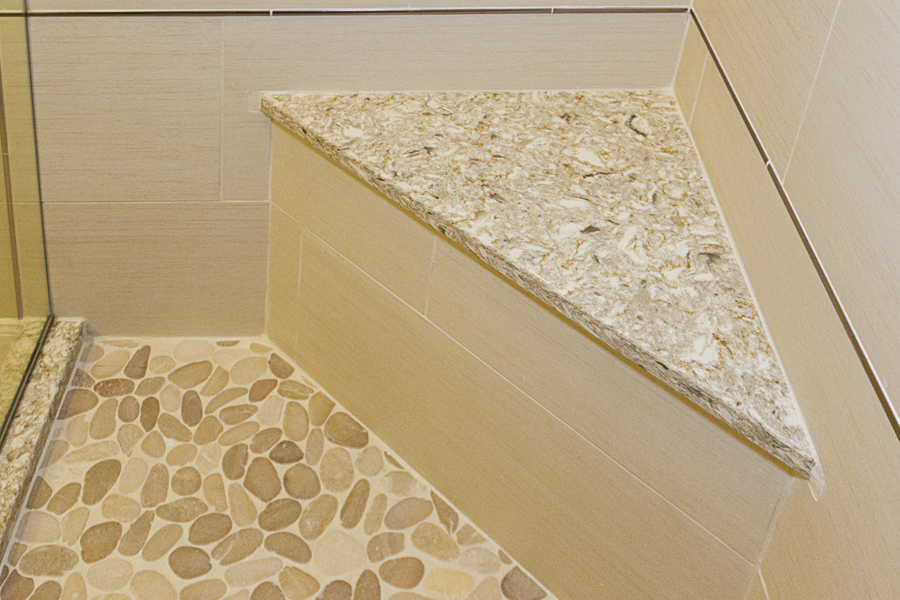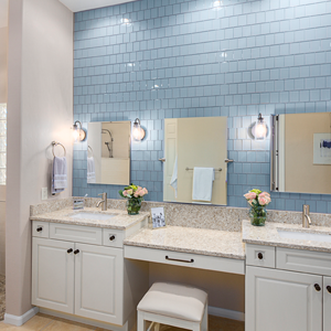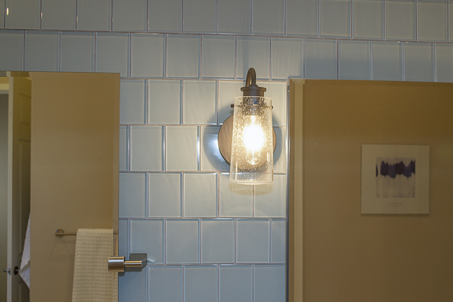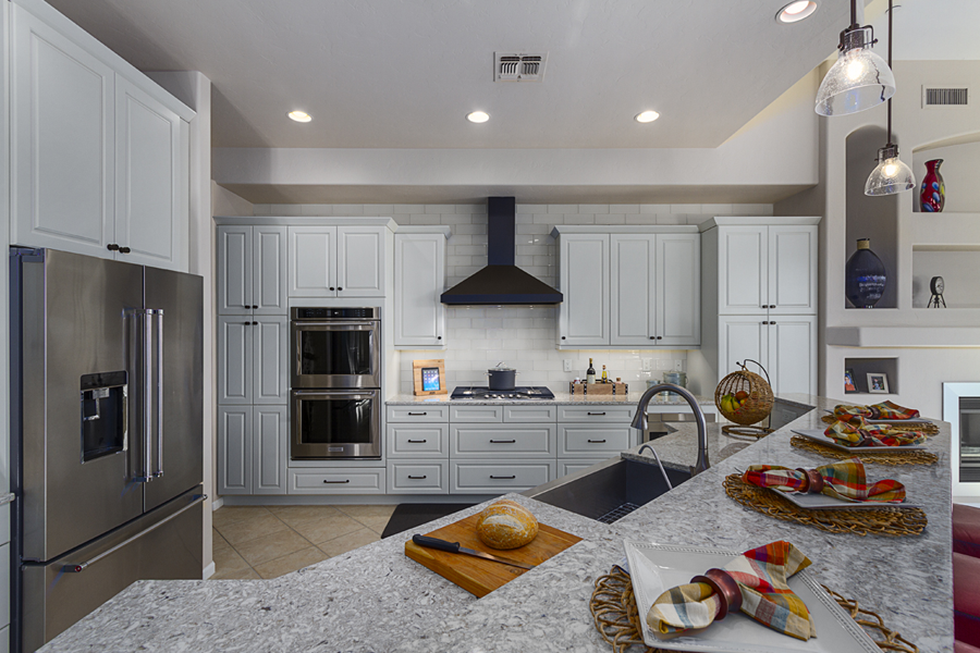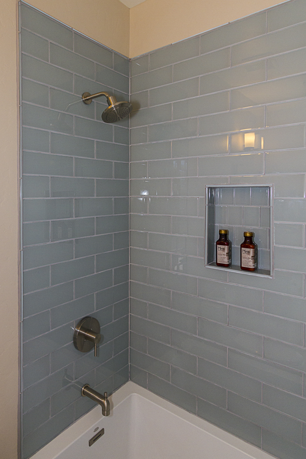 In the kitchen, the details that made the difference were: 1) stacking cabinets higher with glass on one side to add interest 2) adding dark bronze accessories to contrast against the white 3) varying the backsplash design on separate walls and taking it up around the hood area. In the bathroom, the details that made the difference were 1) filling in the floor for a freestanding tub with a natural pebble stone to look intentional 2) accenting with the same bronze in the fixtures and accessories 3) creating feature walls with tile art design.