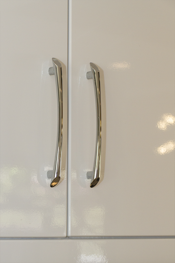 The trick was removing a wall and patching in terrazzo, a new location for all the kitchen appliances and incorporating the unique ceiling coffer and maintaining the sliding doors. Flat panel, high-gloss, white cabinets with white terrazzo floors and white quartz counters are all low maintenance but could be seen as austere. Creating a tile feature wall, adding floating wood shelves, and layers of light balanced this with the addition of a few classic accessories in the bar stools and Nelson clock.