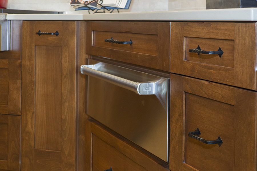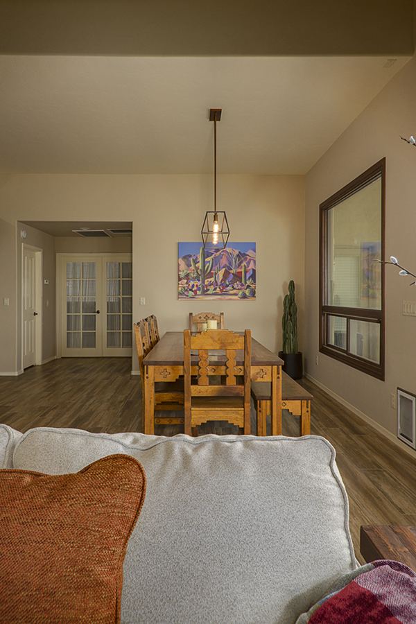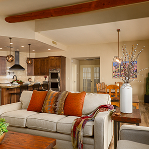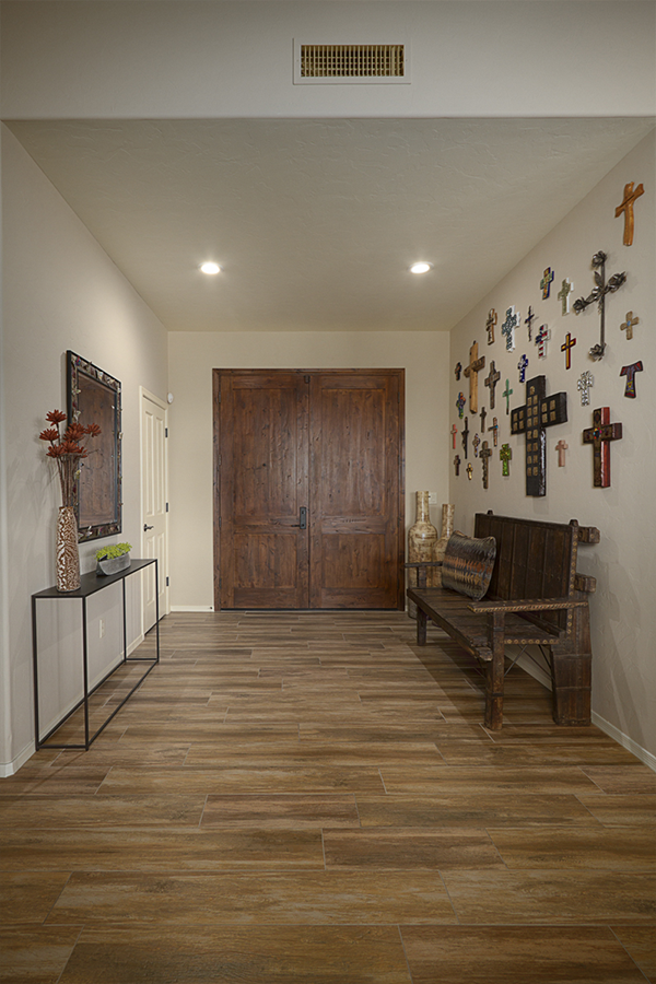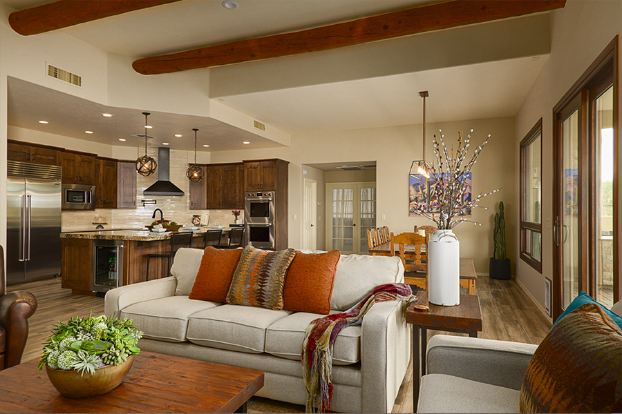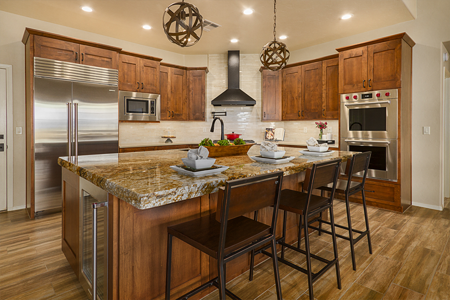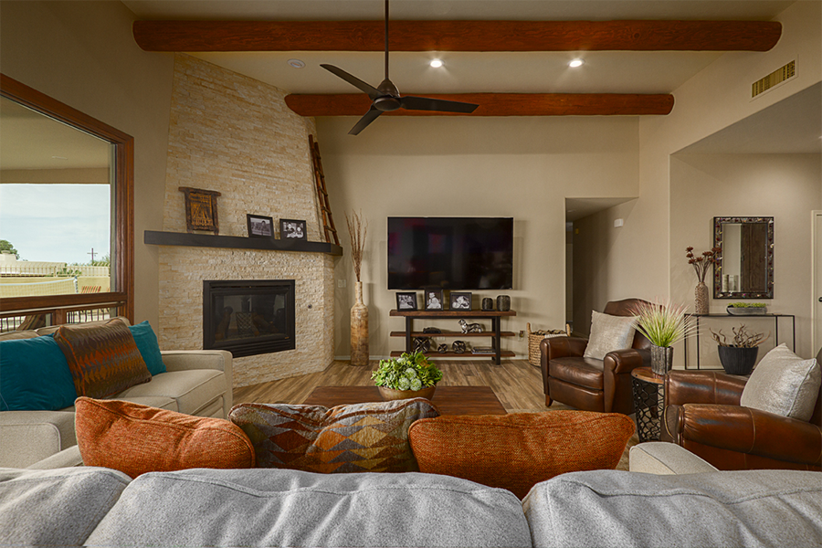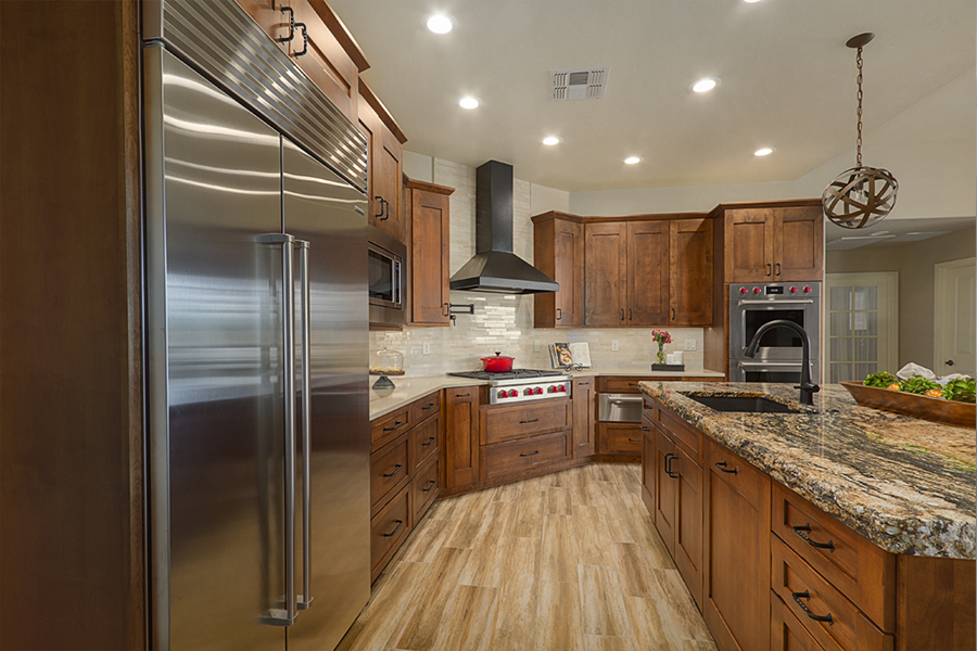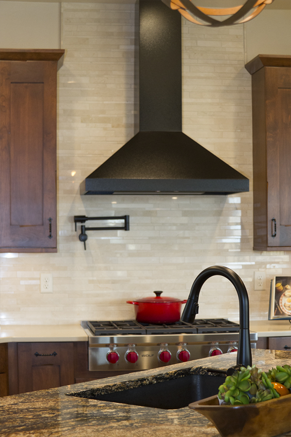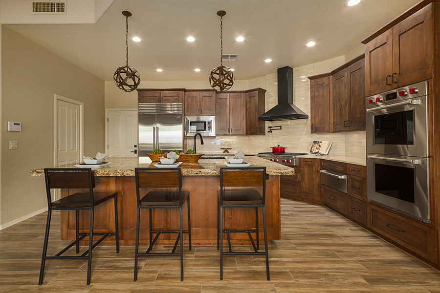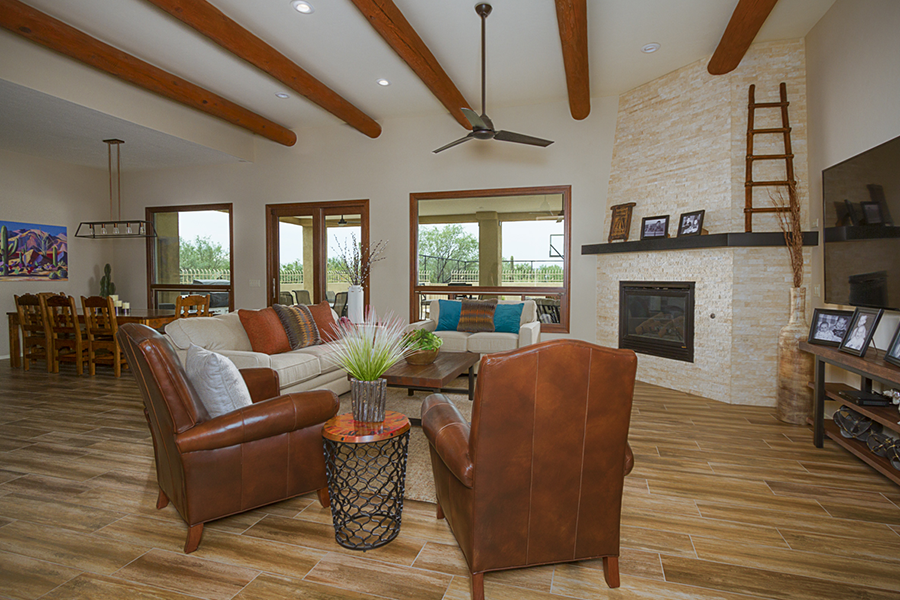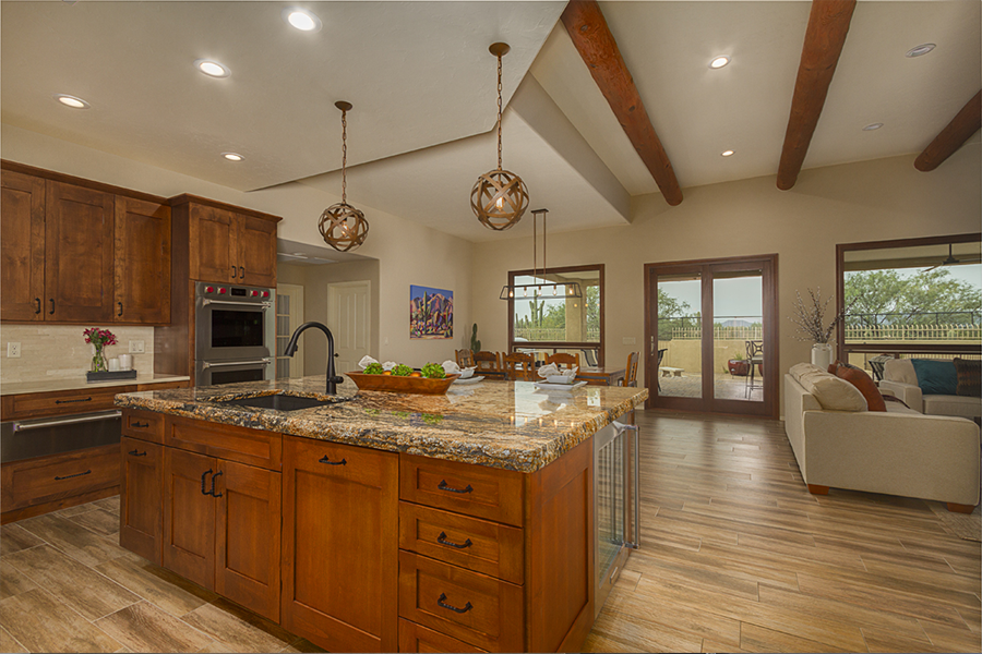 Sophisticated rustic was the theme for this renovation near the Sonoran Desert. We renovated the whole home with this thought in mind. A dated family room looked into the kitchen. I started with a stacked stone fireplace and removed the cutout entertainment center. The custom finish on the cabinets, bronze vent-hood and gourmet appliances add the sophistication the client was seeking.