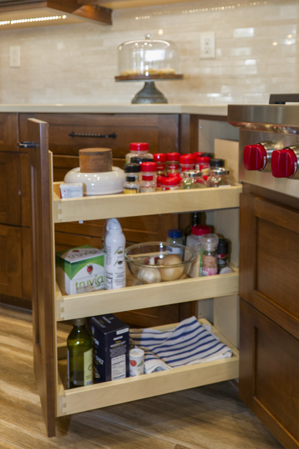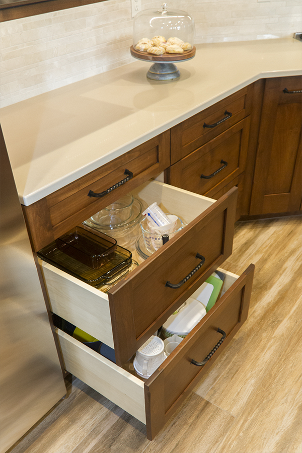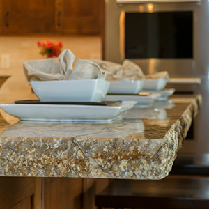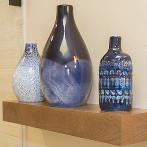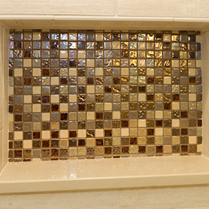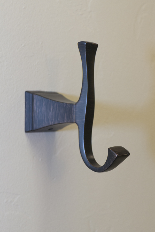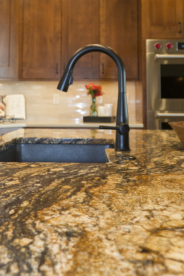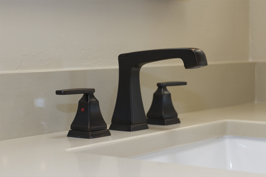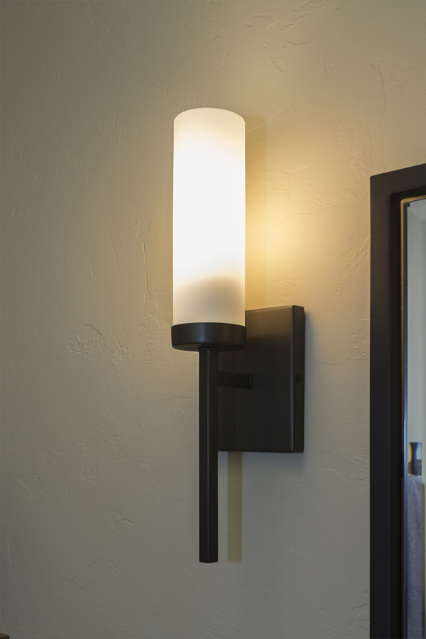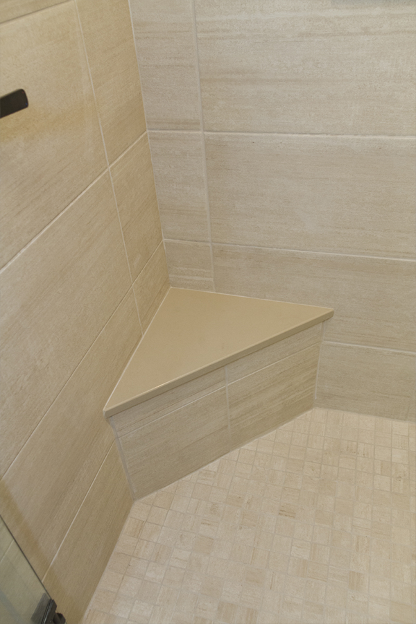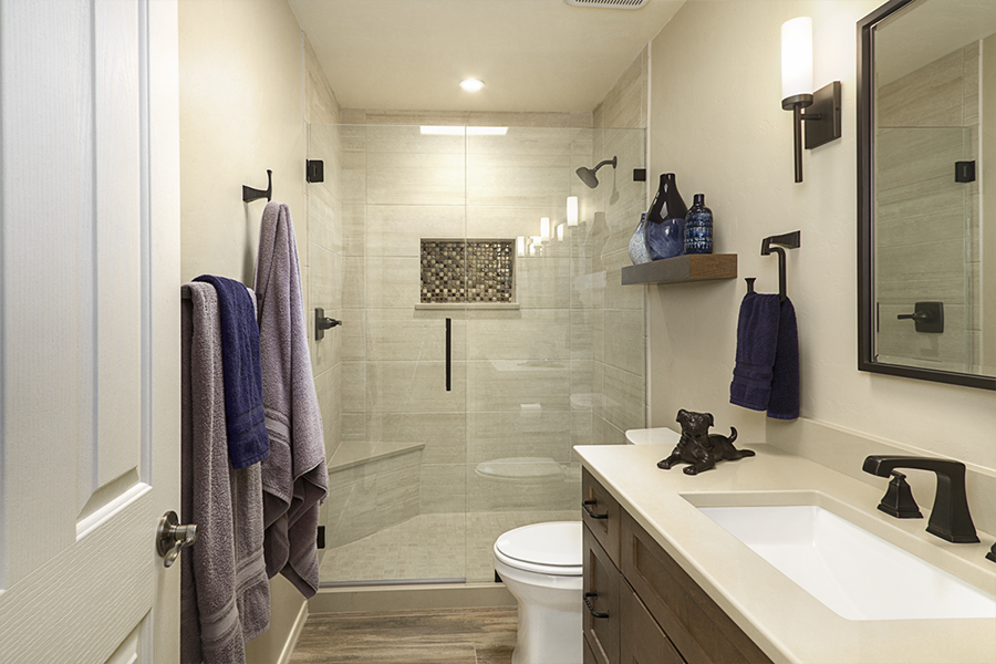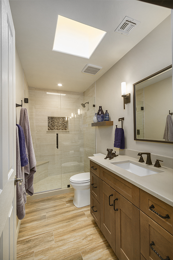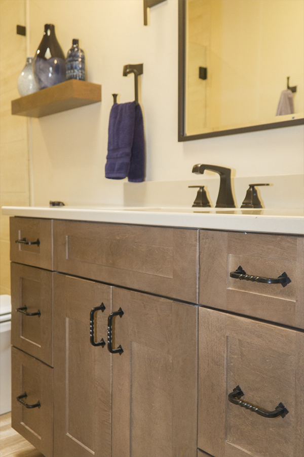 The chiseled edge granite counter-tops on the island and wood plank tile floors add to the rustic appeal, as do the island pendants and travertine backsplash. The same finishes carried into the bathroom. Bronze fixtures and neutral porcelain tile added texture to the small space. The warmth of the stone and fixtures brings a cozy feeling though out the home. The client loves the ease the home brings to them after a long day at work.